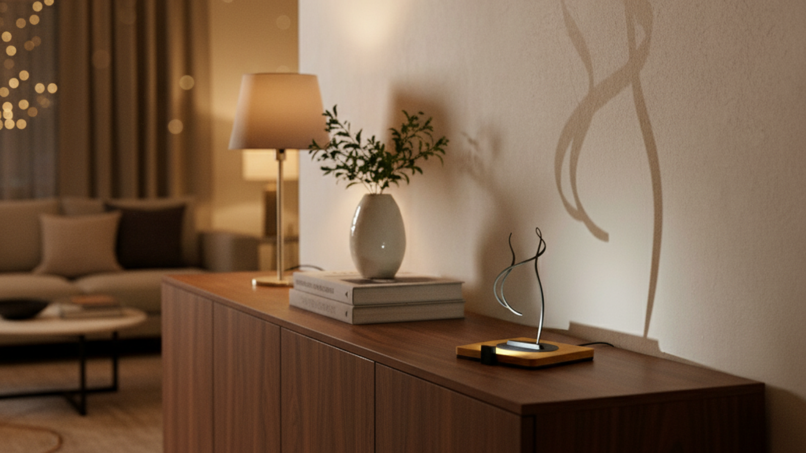 Jede Figur wird durch gezieltes Licht als Schatten an die Wand projiziert – ein kleiner Moment der Ruhe inmitten des Alltags.